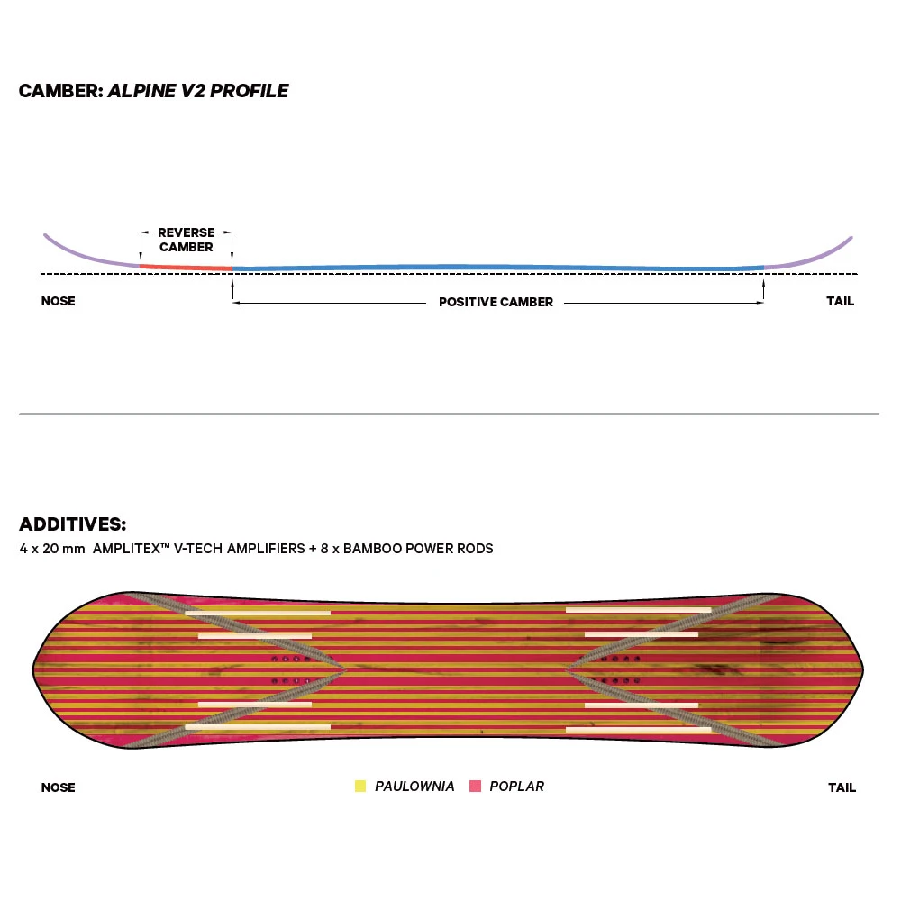 All Terrain Freestyle Performance mit ordentlich Float im Powder, Kazu Style made by Capita! Optimal abgestimmt auf die Bedürfnisse von Kazu Kokubo fühlt sich das gleichnamige Pro Model Snowboard im Backcountry am wohlsten. Der Alpine V2 Hybrid Camber besitzt eine gesunde Vorspannung vom vorderen Bindungsbereich bis ins Tail, dadurch hält das Board seine Spur und bleibt auch bei Hochgeschwindigkeit kontrollierbar. Für mühelosen Auftrieb im Powder sorgt die etwas breitere Rocker Nose. Somit ist das Kazu Pro ein progressives Freestyle Snowboard für jedes Gelände. Der Kernaufbau des Kazu Pro Snowboards besteht aus einem soliden Holzkern mit jeweils 4 Bambusholz-Streifen im Bindungsbereich. Ummantelt wird der sogenannte Panda-Core mit Triax/Biax Fiberglasfasern, welche für Torsionssteifheit und langlebigen Pop zuständig sind. Neu sind die Amplitex V-Tech Flachsfasern, eine natürliche Alternative für Carbon, welche sich in Form von je 2 Bahnen in den Tips befinden. Die Hyperdrive Base sucht in Sachen Schnelligkeit seines Gleichen und rundet das All Terrain Snowboard ab.