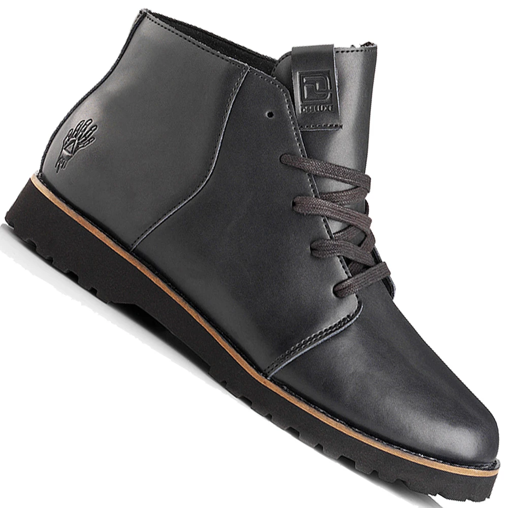 Nobel gehst du durch die Welt – und zwar mit den Deeluxe Mid Top Lederschuhen! Der schwarze Schönling bietet Deeluxe-Fans im alltäglichen Anzug-Business eine kleine Portion Winterfeeling und trotzdem stilsicheres Auftreten. Aber nicht nur zu Feierlichkeiten bringst du die Deeluxe Royal Schuhe in deine Outfits ein, denn dank der Boot-ähnlichen Silhouette kombinieren sich die Winterschuhe ebenso gut zu Jeans und Shirt. Ausgestattet mit klassischem Schnürsystem über Ösen, einer stabilisierenden Fersenkappe, einer Fersenzuglasche und komfortablen Innensohle versprechen die schwarzen Stiefeletten einen hohen Tragekomfort. Zusätzlich sichert eine geschäumte Zwischensohle und ölresistente Außensohle jeden Schritt und bietet leichte Dämpfung für bestes Wohlergehen. By the way: Die kleine geprägte Hand auf der Seite stammt aus der Feder von Gatcode – ehemaliges Team-Member, großartiges Snowboardtalent und nach wie vor Freund der Deeluxe-Familie.