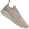Der Keen Uneek macht seinem Namen alle Ehre – er ist wirklich unique, einzigartig. Das Laufgefühl ist wie bei einem Sneaker, die Optik erinnert jedoch an eine Sandale. Prinzipiell ist der Schuh so aufgebaut, dass der Fersenbereich von einem breiteren Band umschlossen ist und der vordere Teil aus geflochtenen Schnüren besteht, die so verknüpft sind, dass sie ein verbundenes Gewölbe ergeben. Die Zunge liegt flexibel unter der Schnürung und ist mit dieser verbunden.