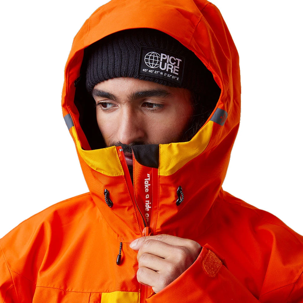 - feste Formkapuze mit weitem Sichtfeld, Schneeblende und mehrfacher Verstellmöglichkeit