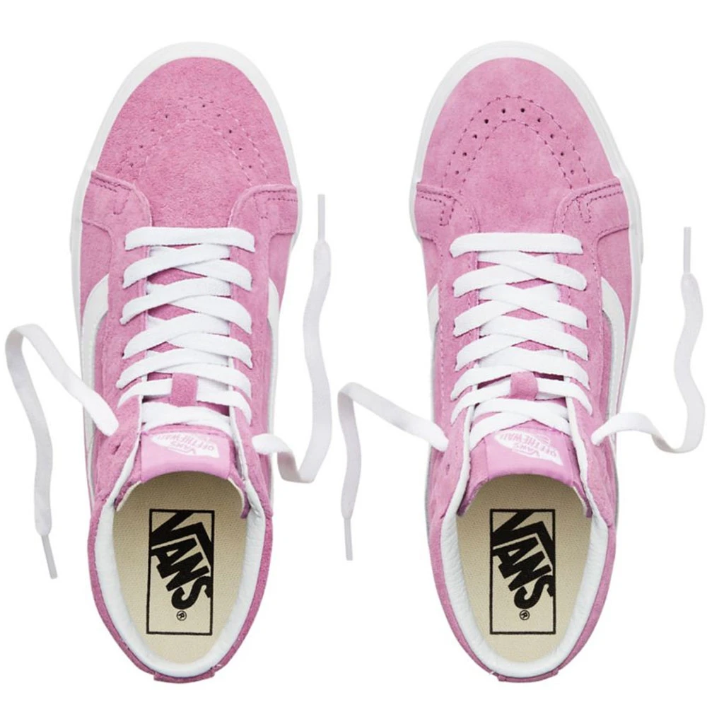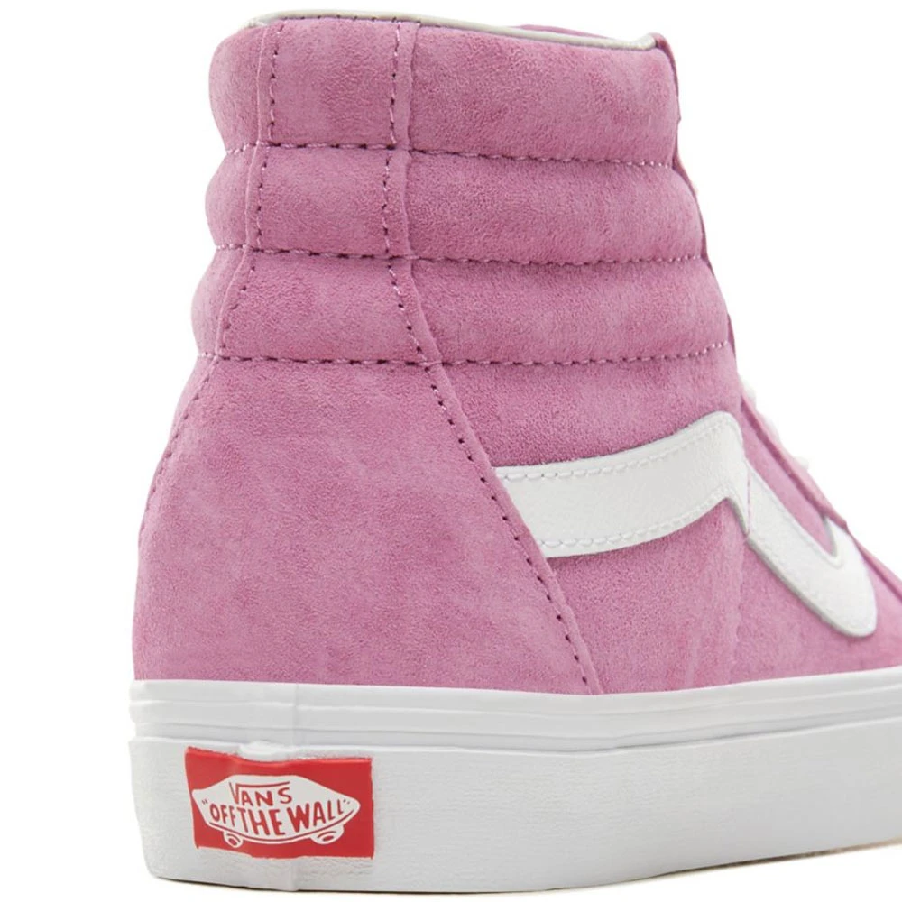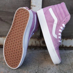 Der aktuelle Sk8 Hi-Top-Sneaker von Vans kommt, dem Wetter getreu, mit hochwertiger Scotchgard-Imprägnierung gegen Schmutz, Wasser und Öl, sowie seiner gewohnt klassischen und knöchelhohen Silhouette. Fast komplett in zarten Lila gehalten, berührt er die Herzen einer jeden Vans-Liebhaberin, denn besonders die kühlere Jahreszeit sollte unter bestem Schutz ein Stück weit bunter gemacht werden. Features wie die Logostreifen auf den Außenseiten, die Schnürsenkel und die Mittelsohle erstrahlen in Reinweiß und verschaffen den Damenschuhen somit eine hohe Kompatibilität in verschiedene Outfits. Dank des wetterfesten Obermateriales spenden die Vans Damenschuhe zuverlässigen Komfort in vielen Schlechtwetterlagen. Das hohe Design bietet zusätzlich einen hohen Tragekomfort, während die Schuhe dank robustem Schnürsystem fest am Fuß sitzen.